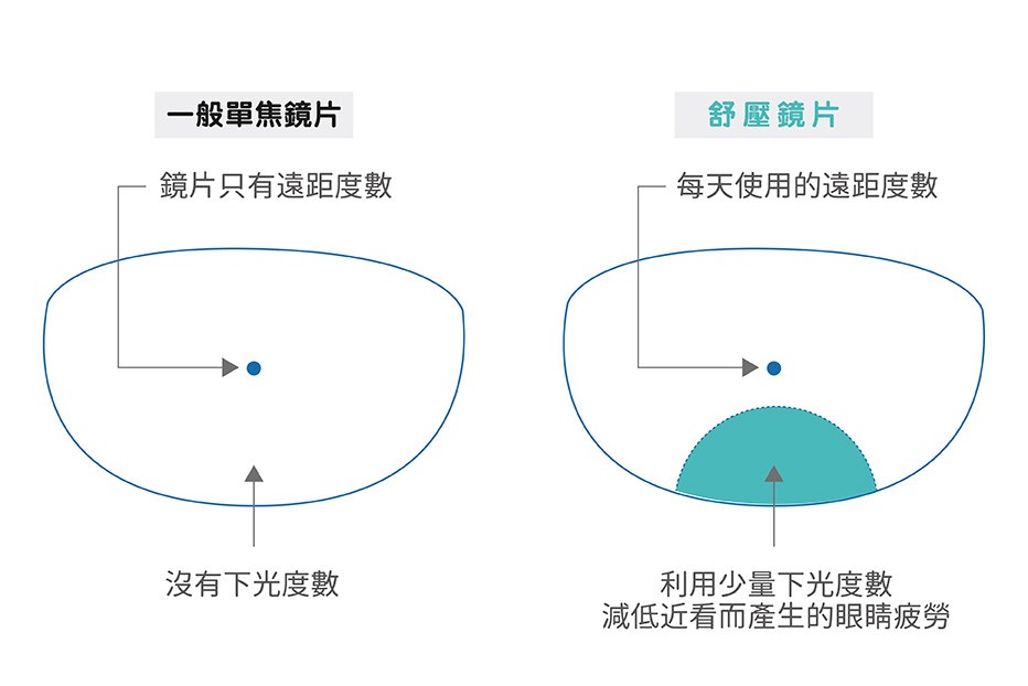當眼睛在看近時,睫狀肌因長時間繃緊而出現視疲勞。舒壓鏡片在「近用視野」區域加入額外輔助度數,讓睫狀肌不用過度調整而放鬆,減少因用眼過度造成的疲勞、頭暈、眼壓感等不適。