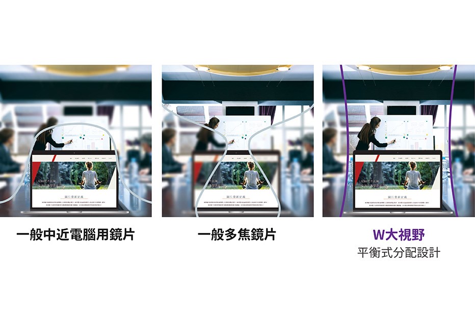 鏡片設計強調視野的寬廣性與穩定性,中距與近距離視區分佈更平衡,提供順暢的視線過渡,幫助您更快適應、減少不適。長時間配戴下,亦能有效降低眼睛疲勞、頭痛、頸部痠痛及暈眩等情況。