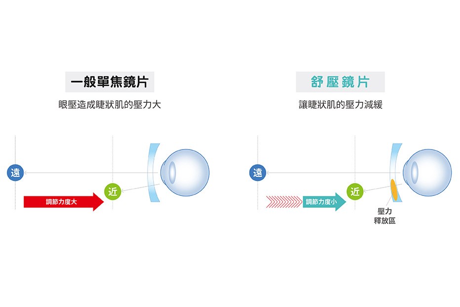 當眼睛在看近時,睫狀肌因長時間繃緊而出現視疲勞。舒壓鏡片在「近用視野」區域加入額外輔助度數,讓睫狀肌不用過度調整而放鬆,減少因用眼過度造成的疲勞、頭暈、眼壓感等不適。
