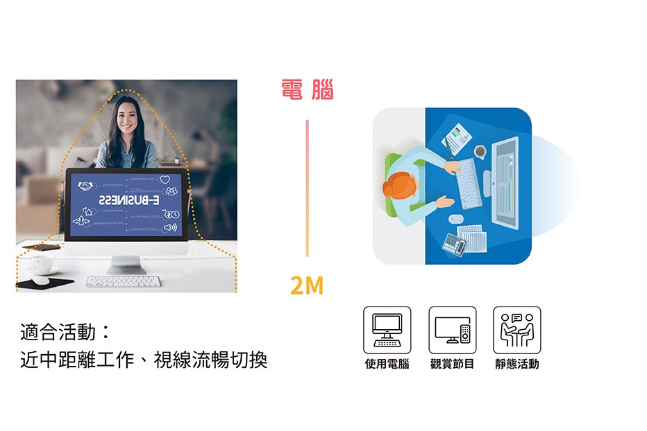 ※一般在螢幕、文件與周遭環境之間頻繁切換用眼,眼睛需要不斷調整焦距與轉動,容易形成疲勞感、乾澀、不適,甚至頭痛。