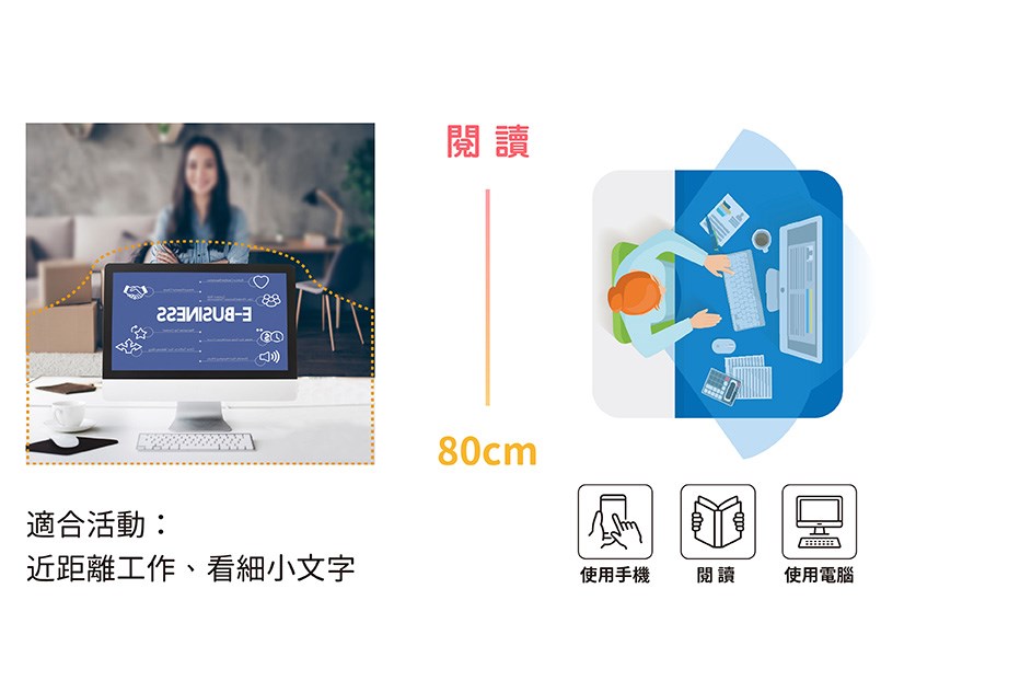※大多閱讀鏡片是為約 40 公分的近距離閱讀設計。但在辦公環境下,您的螢幕、文件、同事走動間的距離往往超過這個距離,閱讀鏡片無法全面覆蓋您的視覺需求。